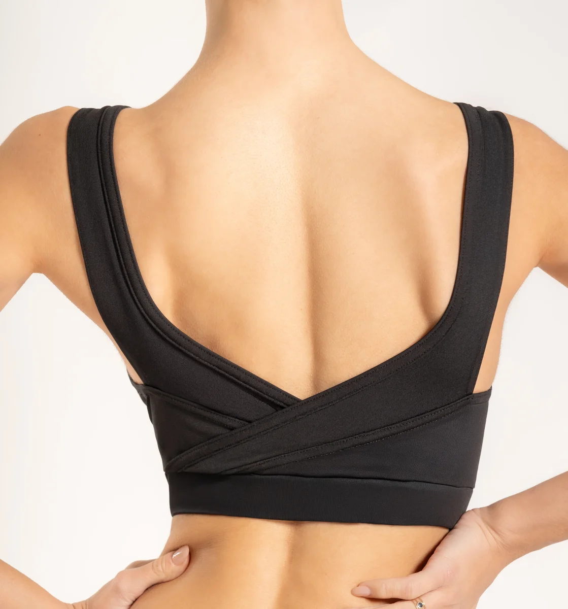 En noir intemporel, cette brassière s’associe facilement avec un legging, un short de danse ou un pantalon fluide, pour un look moderne et élégant en toutes circonstances.