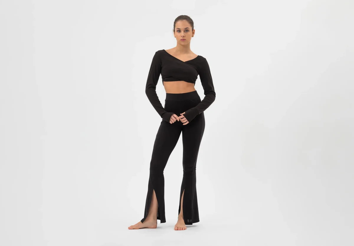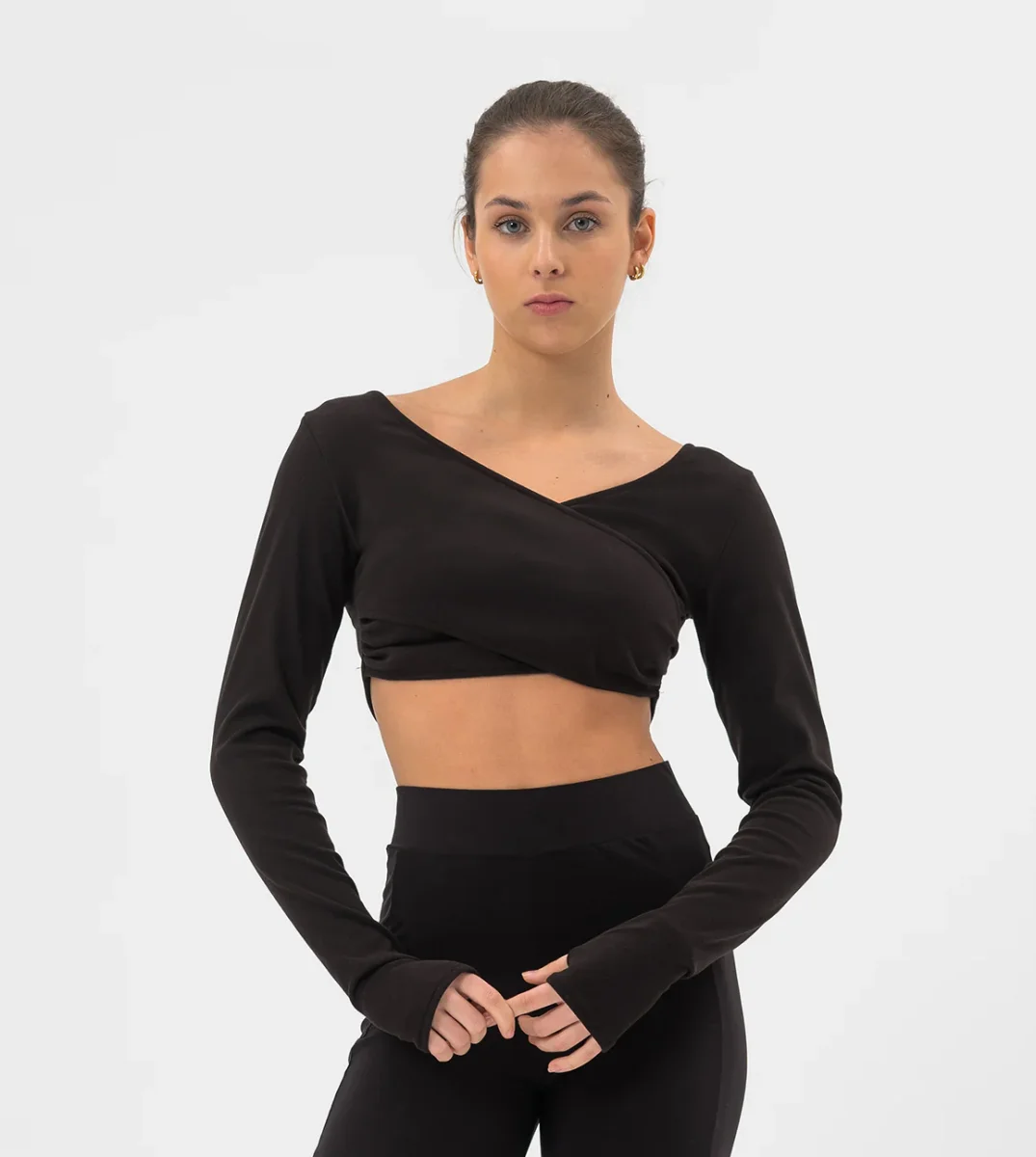 Crop top de danse en polaire PriDance – Manches longues, croisé devant, noir (175)