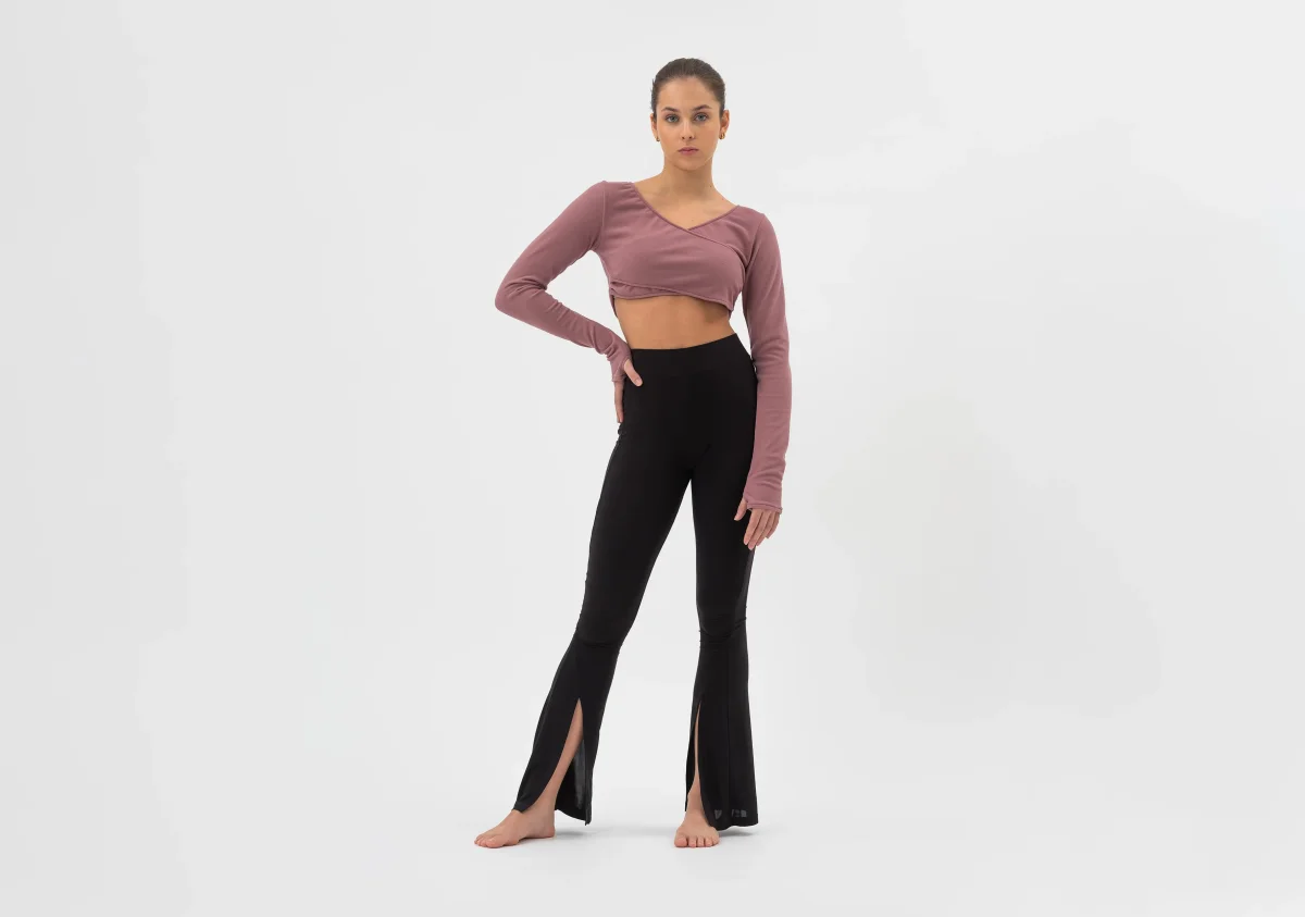 Le crop top de danse manches longues de PriDance séduit par son design croisé sur le devant et sa matière en polaire douce et chaude, idéale pour les échauffements ou les transitions entre deux cours.
