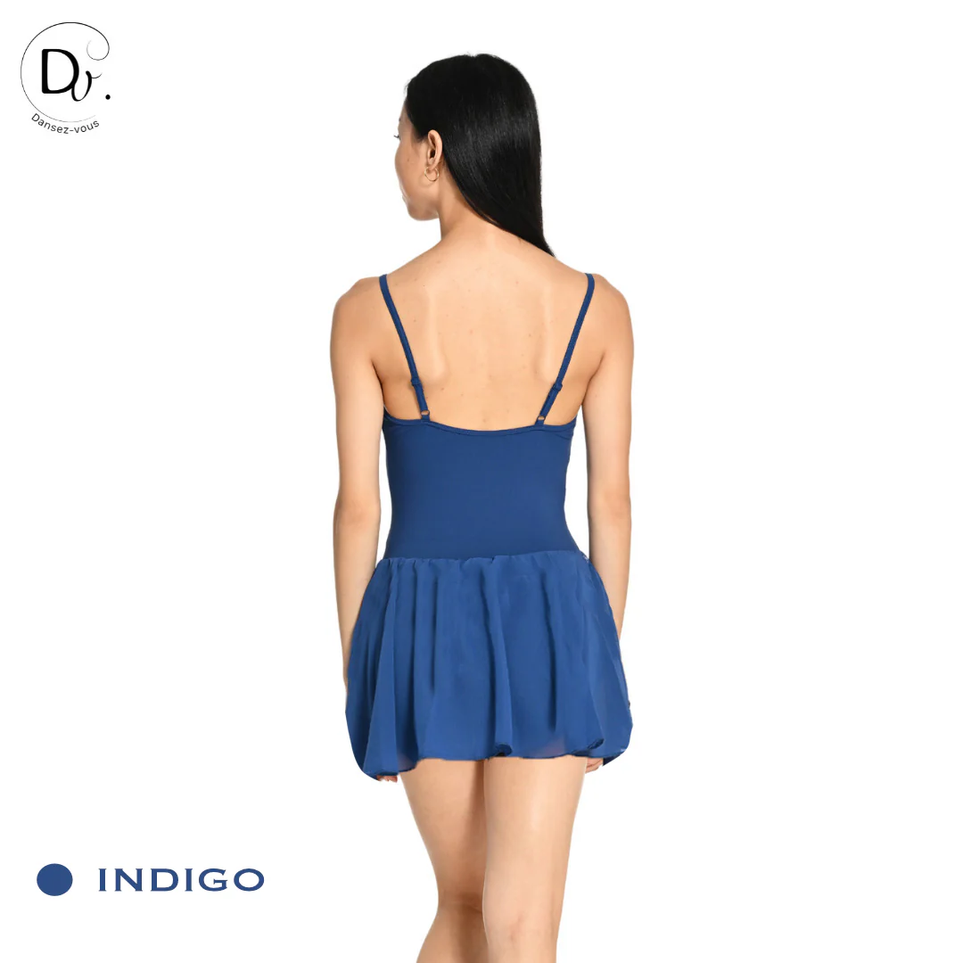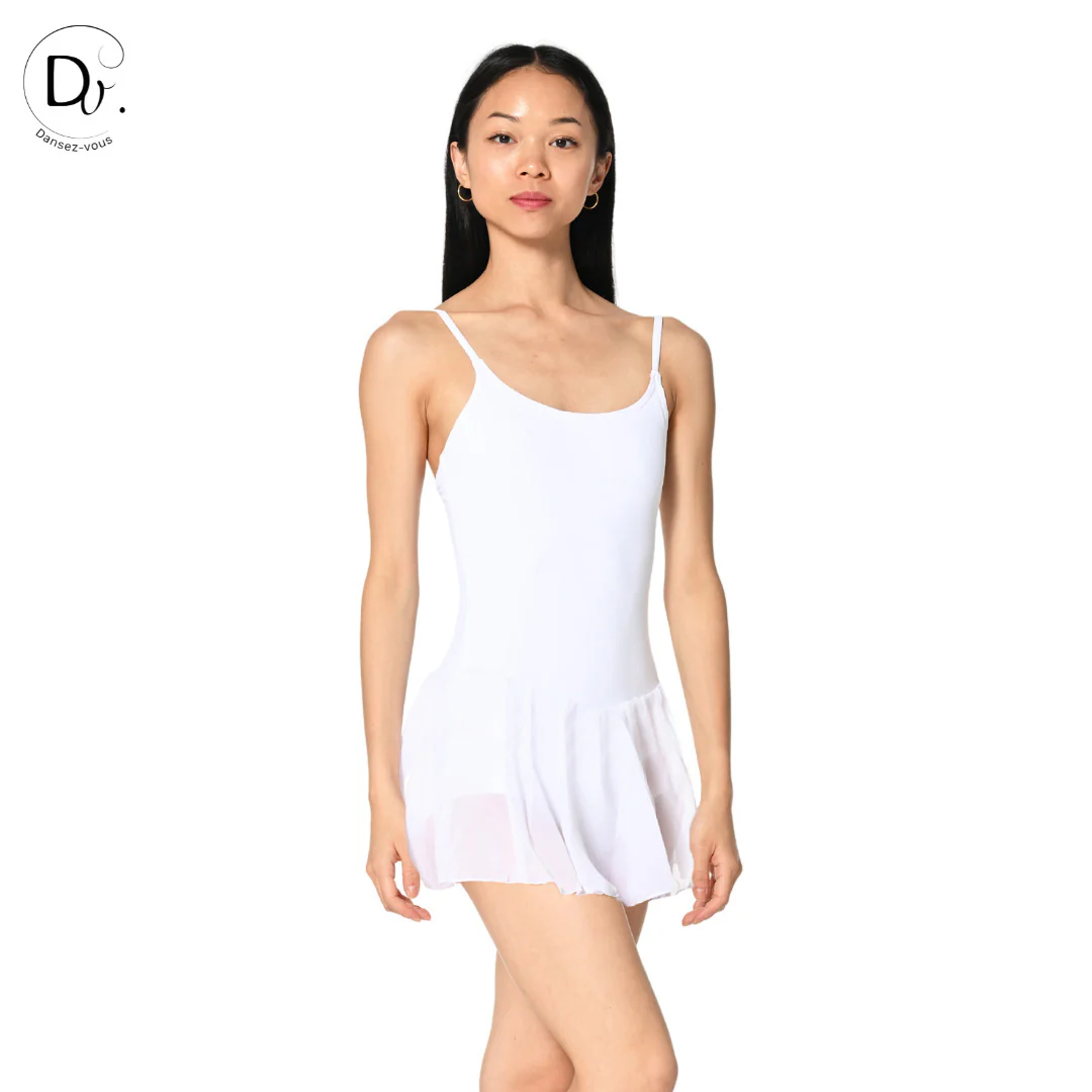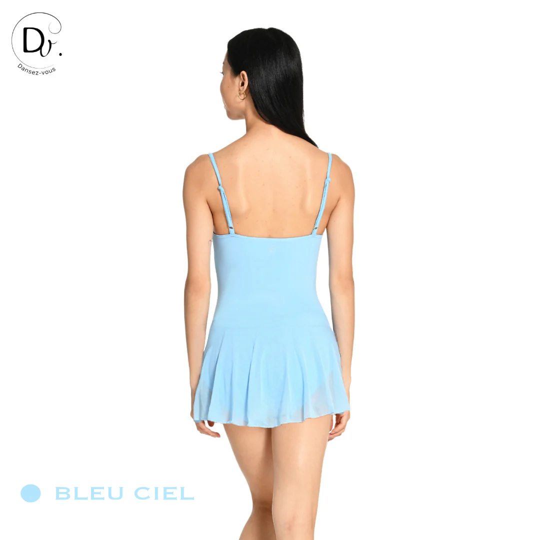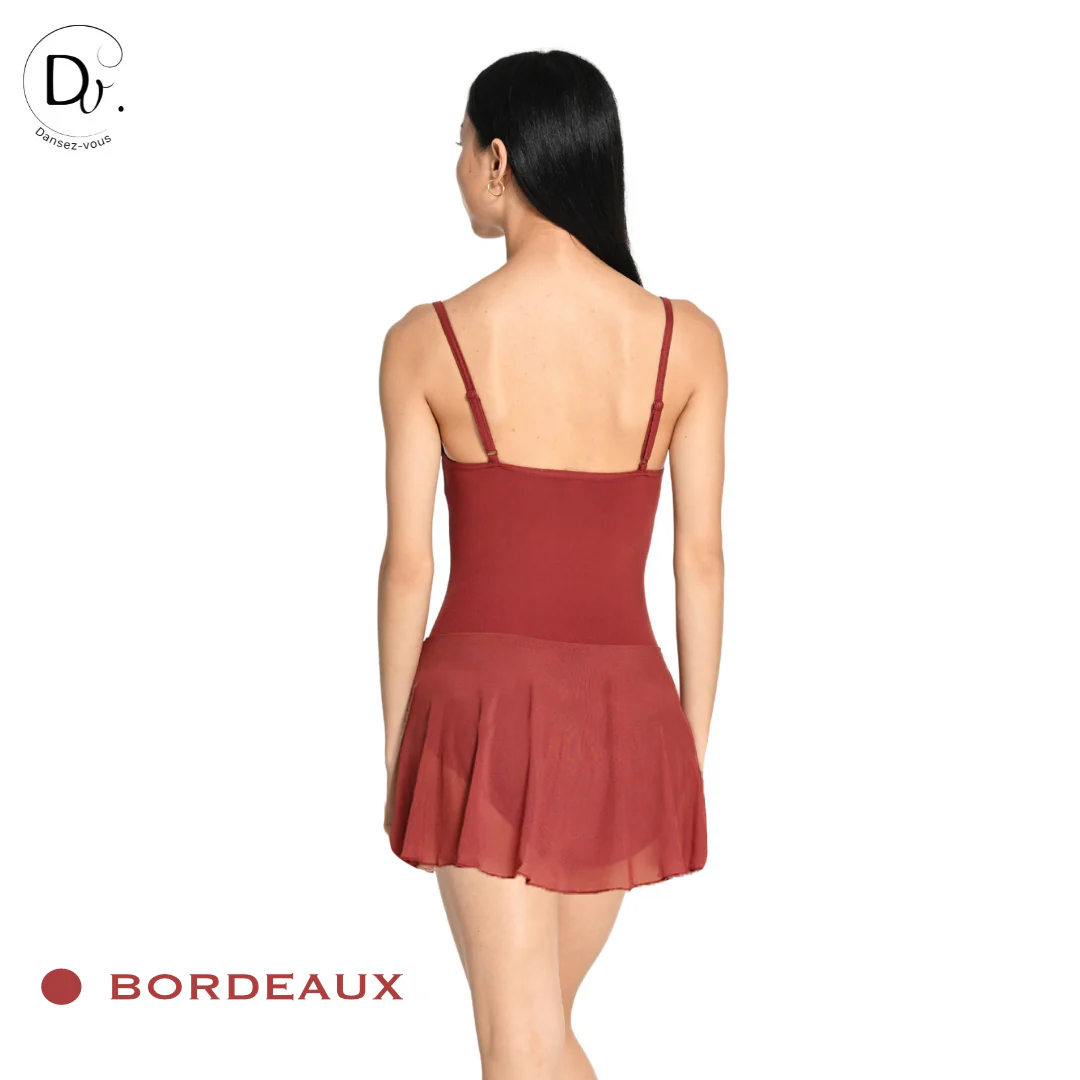 Ses fines bretelles ajustables permettent un ajustement parfait à chaque morphologie, tandis que l’entièrement doublée à l’avant garantit opacité et maintien. La jupe, ton sur ton, apporte fluidité et légèreté, idéale pour les cours de danse classique et les petites représentations.